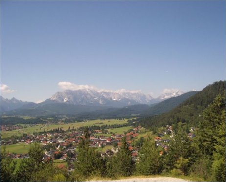 Ansicht von unserer Aussichtsterrasse über Wallgau zum Wettersteingebirge.